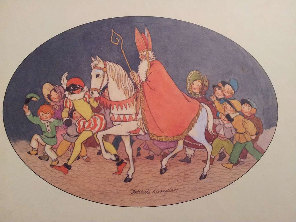 Through the snowfall came a man on a white horse. He wore a tall bishop’s hat and a red cape and held a gold staff in one hand. Beside him walked a figure that appeared to be a chimney sweep, dressed in black and carrying a switch and a big sack.
